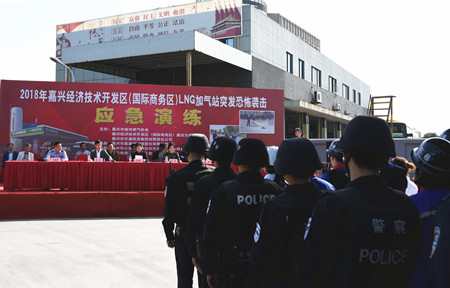 10月19日上午,由嘉通集團、嘉興經濟技術開發區建設交通局、嘉興市城市燃氣協會主辦,嘉興市嘉通新能源股份有限公司承辦,嘉興經濟技術開發區反恐辦協辦的“2018年嘉興經濟技術開發區LNG加氣站突發恐怖襲擊應急演練”在客運中心LNG加氣站順利舉行。