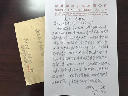 為表達自己的感激之情,王先生專門從寧波寄來了感謝信。做好事的公交駕駛員沈偉師傅談及此事,只是微笑著說:“這只是一件小事,舉手之勞,是我們駕駛員應該做的,沒什么的!”