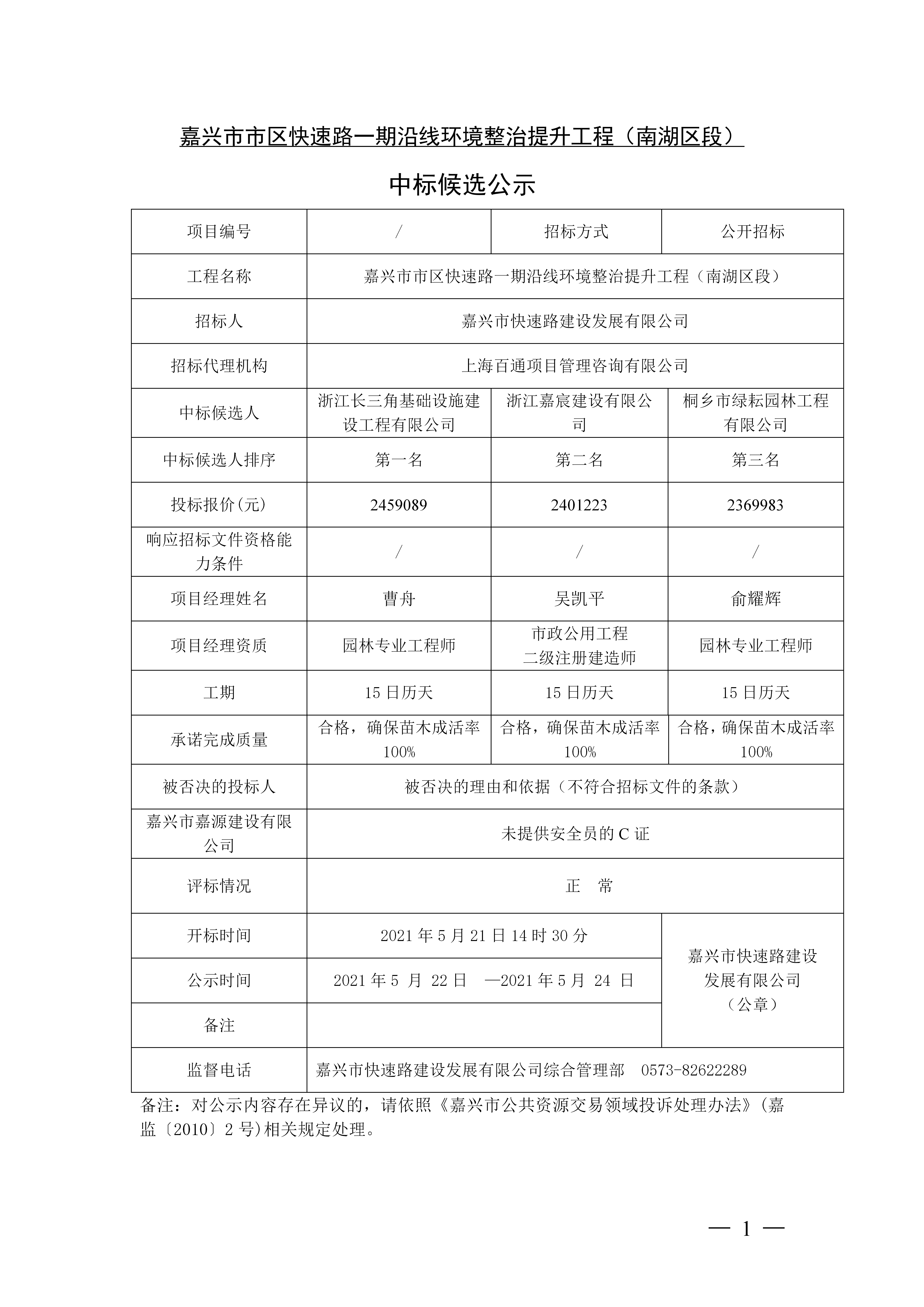 嘉興市市區快速路一期沿線環境整治提升工程(南湖區段) 中標候選公示